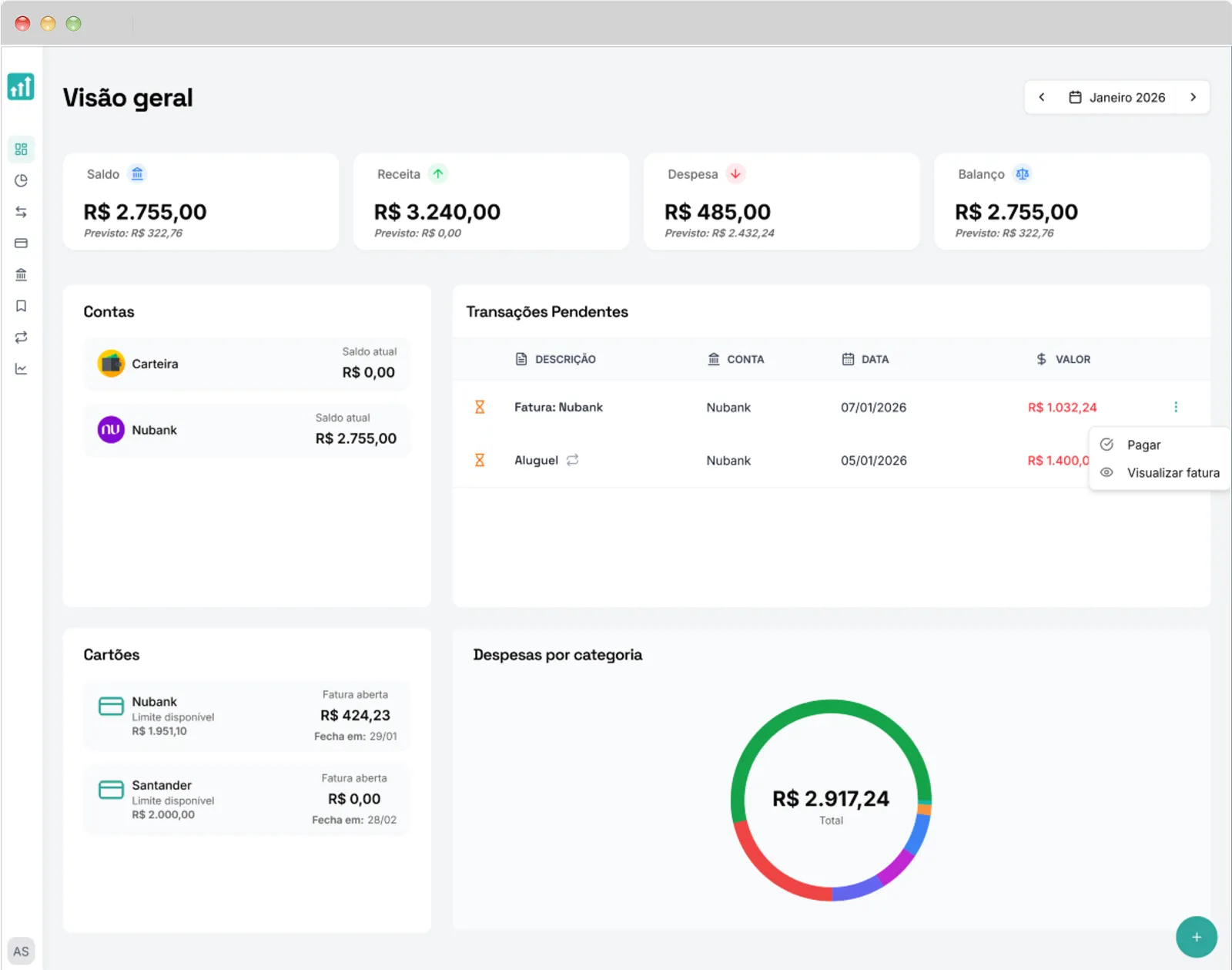 Organize seus gastos, acompanhe cartões de crédito, planeje seu orçamento mensal e tome decisões financeiras melhores — tudo em um único lugar.